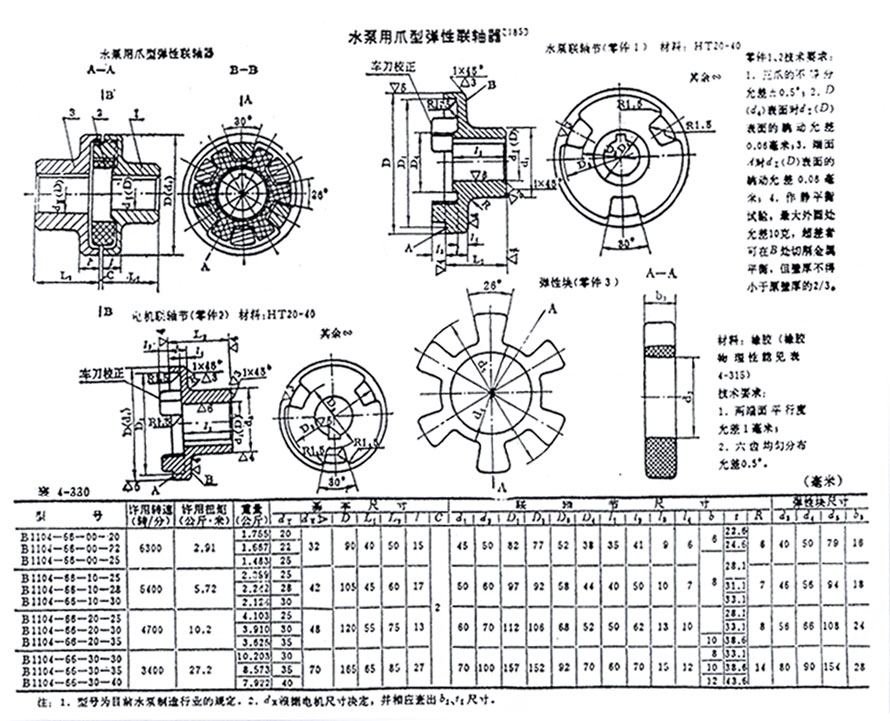 • 爪型聯(lián)軸器是水泵聯(lián)軸器的一種,其中間滑塊用夾布膠木或聚氨酯制成,質(zhì)量輕,結(jié)構(gòu)簡(jiǎn)單,安裝方便,廉,常用于小功率的場(chǎng)合,適用于轉(zhuǎn)矩不大,轉(zhuǎn)速較高,無(wú)急劇沖擊的兩軸連接。尼龍滑塊傳遞轉(zhuǎn)矩較小,但   宜于高速運(yùn)轉(zhuǎn),且不需潤(rùn)滑,水泵行業(yè)的標(biāo)準(zhǔn)代號(hào)為Bl104.